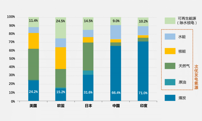 发电结构(2019):中国以煤炭为主,发达经济体以次优能源为主
