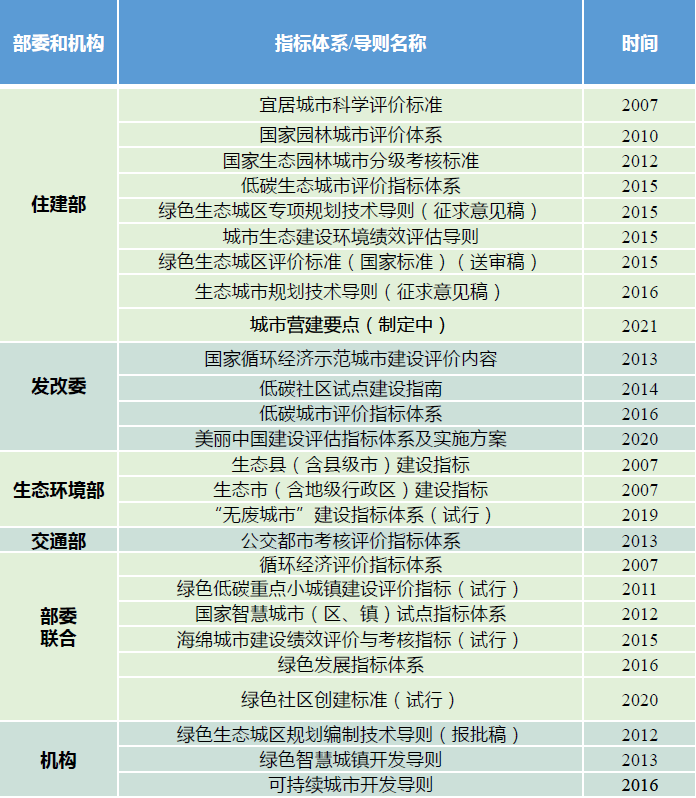 2007年以来,国内相关部委和机构已经制定和发布多项相关标准、评价体系、技术导则、建设指南、指标体系等,其中,部分尚在征求意见或试行过程中。