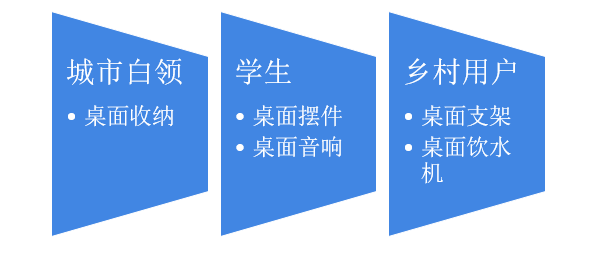从不同群体用户的购买偏好上看,城市白领偏好购买桌面收纳;学生群体偏好购买桌面摆件、桌面音响;乡村用户偏好购买桌面支架、桌面饮水机。
