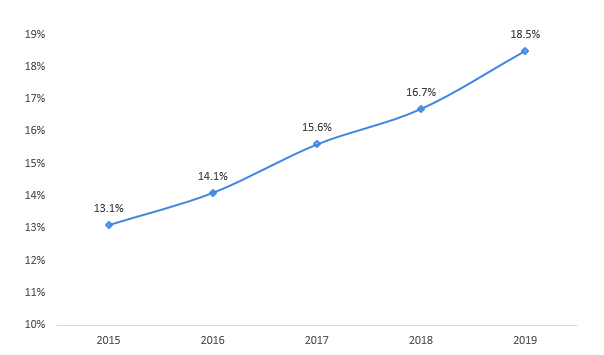 国家统计局图表4:2015-2019年中国一人户占家庭户数比例(单位:%)