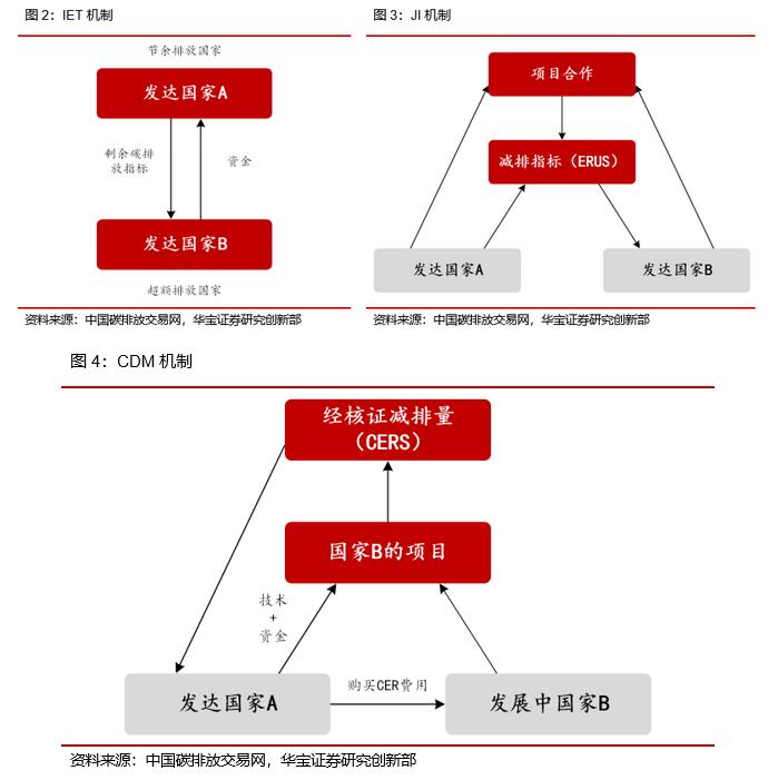 * 国际排放贸易机制(IET):该机制主要存在于发达国家之间,节余排放的发达国家将其超额完成减排义务的指标以贸易的方式转让给未能完成减排义务的发达国家,并同时从转让方的允许排放限额上扣减相应的转让额度。