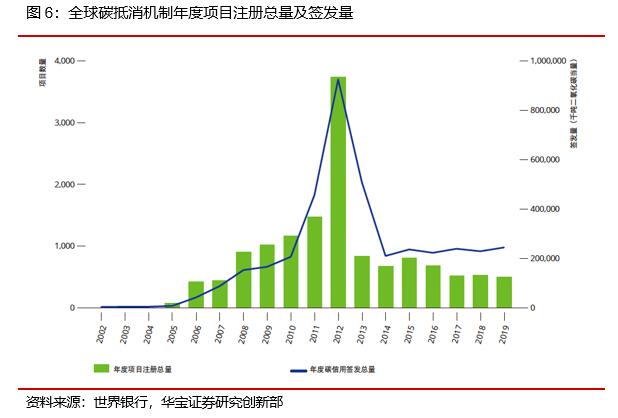 全球碳抵消机制市场在2012年达到顶峰,随后注册量和签发量大幅下滑。一般来说,为加速减排目标实现同时给予减排企业灵活履约的空间,大部分碳市场在初期会建立配套的碳抵消机制,主要用于抵消本市场内的强制履约义务。在2015-2019年间,有4个司法管辖区实施了新的碳信用机制,此外加拿大、墨西哥和南非等的碳信用机制也正处于开发阶段。据世界银行统计,截至2019年12月31日,全球共计注册约14,550个碳信用“项目”;其中,7,759个项目已签发约39亿吨二氧化碳当量的碳减排量,相当于使8.42亿辆乘用车停用一年所产生的减排量;同时,2019年签发碳信用约占当年全球碳信用的17%。但从时间维度上来看,自2013年以断崖下跌后,全球碳抵消机制的年度项目注册总量仍呈下滑趋势,同时自2015年以来,全球碳信用机制的碳信用签发量已下降35%,部分原因是由于中国温室气体自愿减排机制在2017年停止。