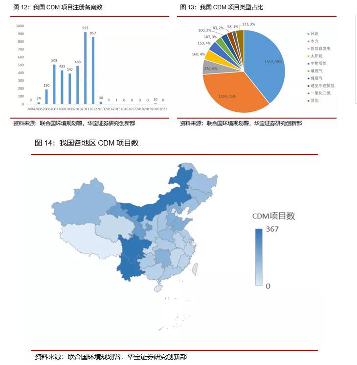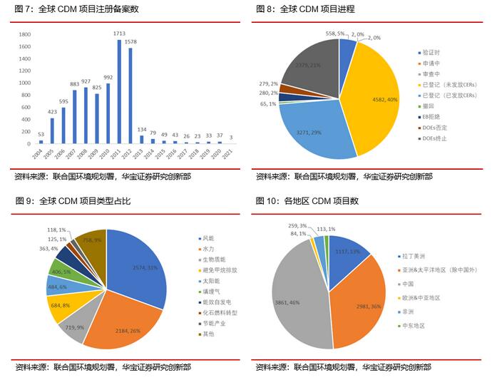 根据联合国环境规划署数据,截至2021年4月1日,除去撤回项目65个,EB拒绝项目280个,DOEs否定、终止项目分别279、2379个外,全球注册备案CDM项目数共计8415个,其中,处于验证阶段项目558个,申请审查中项目4个,已登记未发放CERs项目4582个,已登记已发放CERs项目3271个。从注册时间来看,2004-2012年,全球CDM项目处于高速发展期,9年注册备案项目7989个,占比近95%,2013年后,欧盟碳排放交易体系进入第三阶段,明确可抵消的CERs需来自最不发达国家,全球最大碳排放体系对抵消机制的限制使得注册CDM项目数急剧减少。