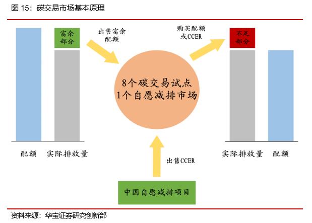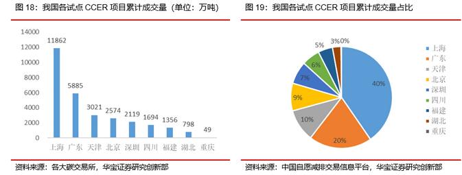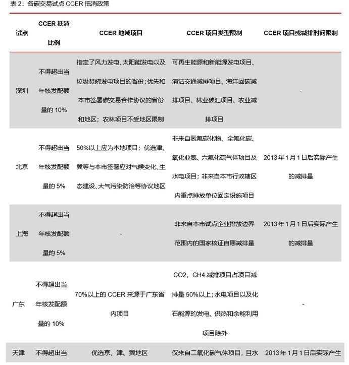 2013年起,受制于欧盟对CDM项目的限制,国内CDM项目数急剧下降,该背景下国内开启着手建立碳交易市场体系——碳排放交易试点市场(ETS)+自愿核证减排机制(CCER)。具体来看,我国借鉴欧盟碳交易机制(EU-ETS)在北京、天津、上海、湖北、广东、深圳、重庆、福建、四川九个省市率先开启区域碳排放交易试点,于此同时,我国借鉴《京都议定书》中的碳抵消机制清洁发展发展机制(CDM)搭建适用于国内的自愿核证减排机制(CCER)。