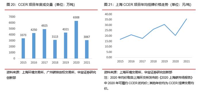 从时间维度上看,CCER项目成交量与价格均呈现波动上涨趋势。截至2021年5月30日,2021年中国碳市场CCER累计成交量3067万吨,已接近2020年成交量的一半,预计在CCER抵消机制不明确前,本年度成交量与去年基本持平;从交易最为活跃的上海CCER二级市场挂牌交易的均价来看,CCER价格呈现较为明显的上涨趋势,主要原因在于:首先,2017年停止CCER备案后,CCER存量随着履约消耗而逐年减少;其次,当前全国统一碳市场的抵消机制还未明朗,随着今年6月底统一全国碳交易市场开市,在未来CCER价格上涨的预期下,CCER持有者可能会持观望态度。就价格而言仍需要注意的是,大量CCER的交易其实是通过线下协议的方式完成的,例如上海碳市场2015-2020年线下协议交易总量是挂牌交易量的4.5倍,但线下协议交易价格远低于线上挂牌交易价格,例如上海碳市场2017-2019年年度线上挂牌交易的均价为线下协议交易均价的8-11倍;同时,不同类型项目产生的CCER的价格也存在一定差异,未来环保效益确定性强的项目产生的CCER的价格具备更大的上涨空间。