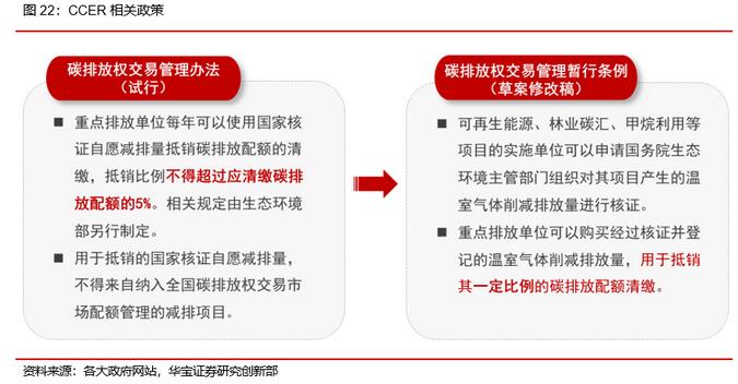 从政策上来看,当前未明确全国碳交易市场核证减排抵消比例的量化指标。2021年3月,生态环境部发布《碳排放权交易管理暂行条例(草案修改稿)》(征求意见稿)(简称“暂行条例”),本次暂行条例明确提出重点排放单位可以购买经过核证并登记的温室气体削减排放量,用于抵销其一定比例的碳排放配额清缴。相比而言,2021年1月发布的《碳排放权交易管理办法(试行)》(简称“管理办法”)明确抵消比例为5%。暂行条例没有明确的量化为增加核证减排量抵消碳排放配额创造了空间,放宽了实施可再生能源、林业碳汇、甲烷利用等项目来实施碳减排。