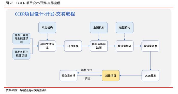 CCER 项目的开发流程主要包括 6 个步骤,依次是:项目文件设计、项目审定、项目备案、项目实施与监测、减排量核查与核证、减排量签发。项目业主首先向国家主管部门申请,并由专门的审核机构核查改减排项目,项目核准通过得到备案。经备案的 CCER 项目产生减排量后,项目业主再次申请核查并于通过后获得减排量签发,国家发改委会将项目发布到 CCER 登记簿上即可等待交易。