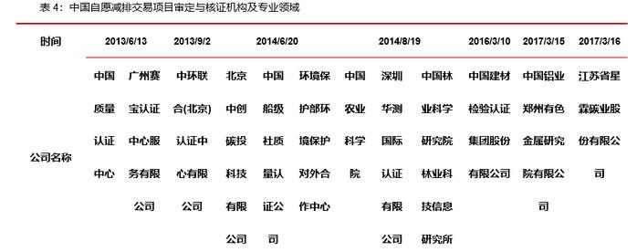 CCER审定核证资质门槛高,仅有12家机构获得。《温室气体自愿减排交易管理暂行办法》指出,参与温室气体自愿减排交易的项目应采用经国家主管部门备案的方法学并由经国家主管部门备案的审定机构审定。经备案的自愿减排项目产生减排量后,作为项目业主的企业在向国家主管部门申请减排量备案前,应由经国家主管部门备案的核证机构核证,并出具减排量核证报告。截至目前,发改委气候司共公布12家具备自愿减排交易项目审定与核证资质的机构。具体来看不同的机构可参与审定和核证的专业领域有所不同,其中中国质量认证中心和中环联合(北京)认证中心有限公司具备15项审定核证能力居于首位。