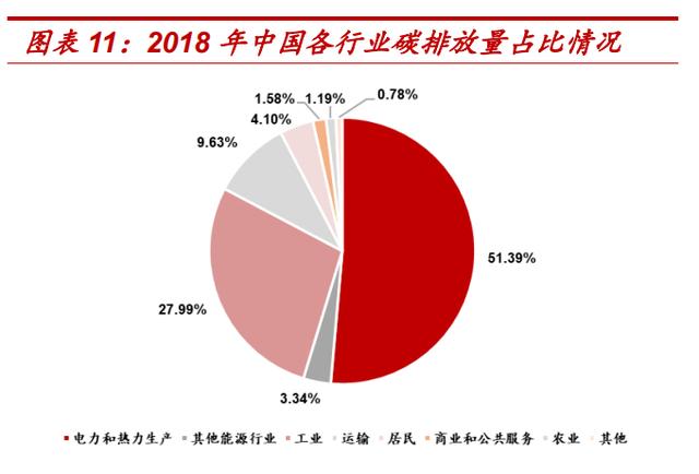 电热生产、工业及交通运输是二氧化碳的主要来源。根据 IEA 数据,2018 年全球电热生产、工业、交通运输行业二氧化碳排放量分别为 13978、 6158、8258 百万吨,占全球碳排放量的比例分别为 41.71%、18.37%、 24.64%,合计占比达 84.72%,是二氧化碳的主要来源。从国内数据来 看,上述三大行业同样为二氧化碳排放的主要来源,合计占比达 89.01%, 但国内电热生产行业二氧化碳排放量占比超 50%,高出全球 9.68pct, 反映出电热生产行业是我国二氧化碳最为主要的来源。因而,电热生产 行业或成为国内控制碳排放的重点关键行业。