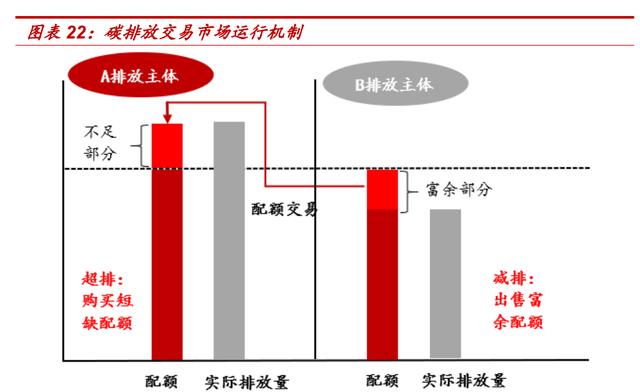 为采用市场化机制激励碳排放主体减排,碳排放交易市场形成。根据世 界银行,碳排放交易市场(ETS)是一项减排政策工具,为排放者设定 排放限额,允许其通过交易排放配额的方式进行履约。在碳排放交易市 场运行机制中,在给定碳排放配额后,减排主体将富余配额出售给配额不足的超排主体,并通过价格机制引导碳排放主体降低碳排放量,进而 达到控制碳排放的目的。碳排放交易市场的形成与发展促进碳排放权使 用效率提升,并激励碳排放主体积极推进碳减排,有助于有效控制碳排放总量,助推碳中和落地实现。
