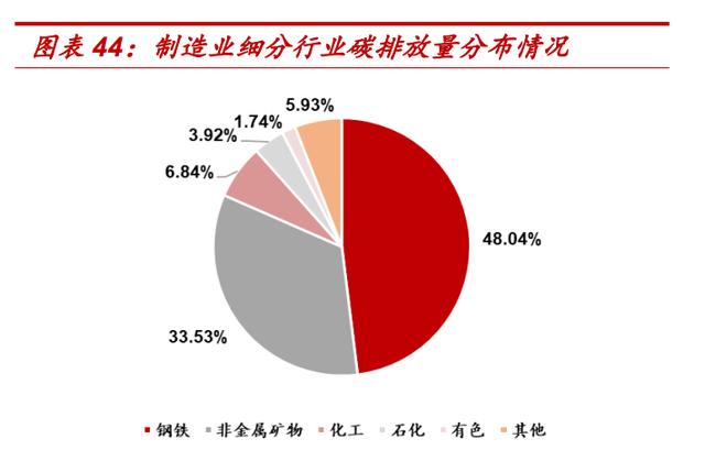 工业是二氧化碳排放的主要来源,钢铁、建材、化工等制造业碳排放量 较大。由于工业领域能源使用量大,根据国家统计局数据,2019 年工业 领域在国内能源消费总量中占比超 60%,大量能源消耗使得工业领域成 为我国碳排放的主要来源之一。IEA 数据显示,中国工业领域碳排放量 由 1990 年的 745 百万吨增至 2018 年的 2667 百万吨,增长幅度达 257.99%,且长期工业领域碳排放量在总的碳排放量中占比在 25%以上 水平。此外,根据 CEADs 数据,在制造业细分行业中,钢铁、建材、化工是二氧化碳排放的主要来源,在制造业总的碳排放中占比分别为 48.04%、33.53%、6.84%。因而,工业领域碳控排可优先从钢铁、建 材、化工等碳排放量大的行业推进。