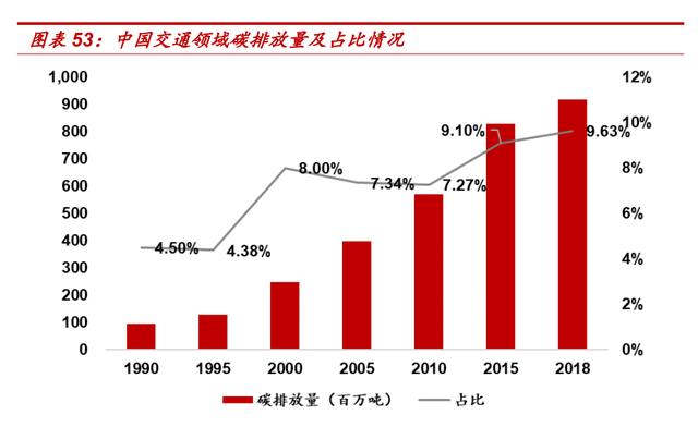 交通运输是碳排放的来源之一,推动交通运输领域碳减排具有必要性。IEA 数据显示,中国交通领域碳排放量由 1990 年的 94 百万吨增至 2018 年的917百万吨,增长幅度达875.53%,在总的碳排放量中占比由4.50% 升至 9.63%,呈持续增长态势。因而,推进交通运输领域碳减排是实现 碳中和发展的必要举措。
