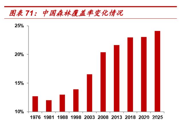 森林蓄积量持续提升,显著吸收碳排放量。根据国家统计局数据,截至 2019 年,我国森林蓄积量达 175.60 亿立方米,同时国家林业草业局数 据显示,截至 2020 年,我国森林覆盖率达 23.04%。