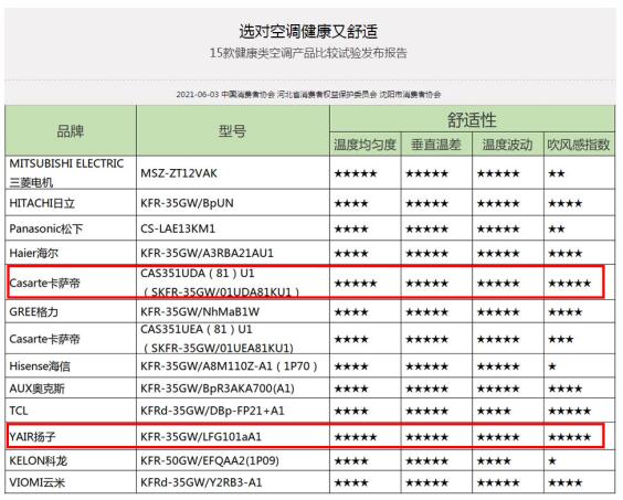 日前,中消协发布了一份15款健康类空调产品比较性试验报告,就专门针对舒适性进行试验,试验报告显示,各空调品牌在多项功能指标的评分中结果突出,特别是在温度均匀度、垂直温差、温度波动、吹风感指数四大舒适性指标上,卡萨帝、扬子两本土品牌在相应功能上取得全部最高的五星评价。