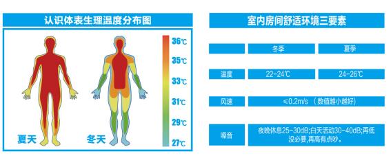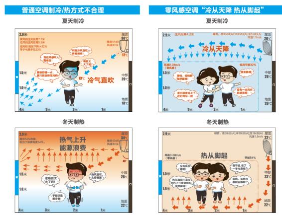 从上图的对比中可以看出,舒适性空调相对普通空调,在温度、风向、风速、噪音值等方面,都是基于人体对环境的需求而特别设计,尤其在吹风感方面的设计,实现“冷从天降、热从脚起”。
