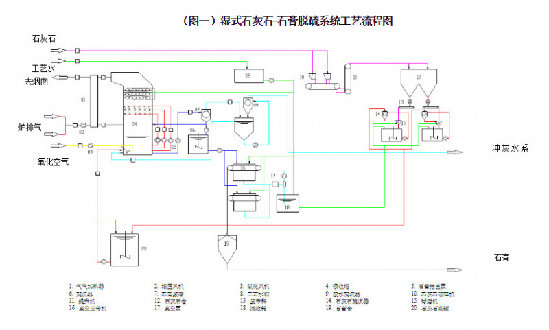 石灰石(石灰)/石膏湿法脱硫工艺系统主要有:烟气系统、吸收氧化系统、浆液制备系统、石膏脱水系统、排放系统组成。