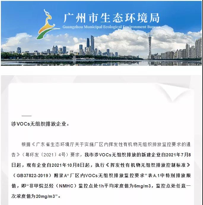 众所周知,6月8日,广东省生态环境厅发布《关于实施厂区内挥发性有机物无组织排放监控要求的通告》,要求省内涉及VOCs无组织排放的新建企业自本通告施行之日起,现有企业自2021年10月8日起,全面执行《挥发性有机物无组织排放控制标准》(下称《标准》)附录A“厂区内VOCs无组织排放监控要求”。昨日,即6月14日,广州生态环境发布一则《致我市涉VOCs无组织排放企业的一封信》,要求涉VOCs无组织排放的新建企业自2021年7月8日起,现有企业自2021年10月8日起,执行《挥发性有机物无组织排放控制标准》(GB37822-2019)附录A“厂区内VOCs无组织排放监控要求”表A.1中特别排放限值,即“非甲烷总烃(NMHC)监控点处1h平均浓度值为6mg/m3,监控点处任意一次浓度值为20mg/m3”。