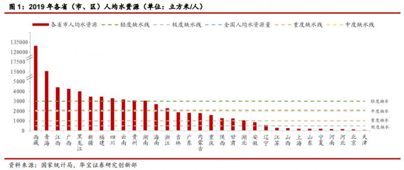 水资源短缺情况严峻,人均水资源区域分布不均。截至 2019 年,我国人均水资源量为2077.7 立方米/人,略高于中度缺水线(2000 立方米/人)。从各省(市、区)的分布来看,11 个省(市、区)的人均水资源量在重度缺水线以下,2 个位于重度缺水区间,7 个位于中度缺水区间,2 个位于轻度缺水区间。由此可见,我国水资源短缺情况较为严峻,经济发达省份大都属于缺水区域,呈现区域分布不均的形势。