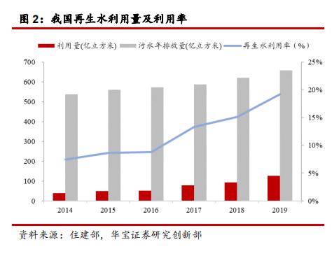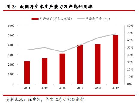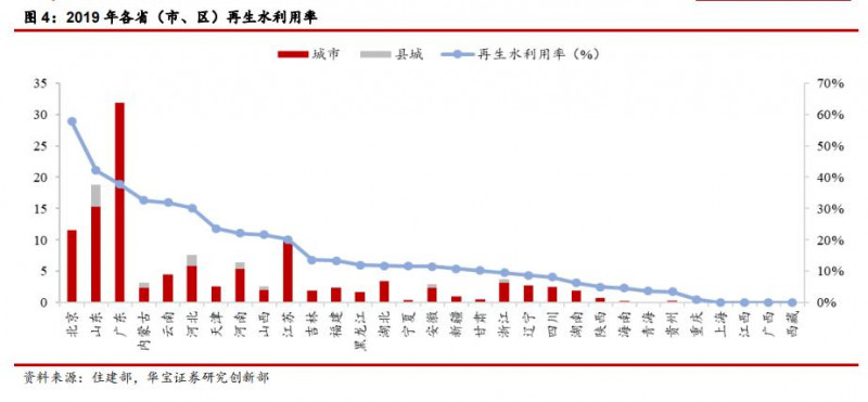 再生水利用率较低,发展空间大。根据住建部《城乡建设统计年鉴》,2019 年我国再生 水利用量为 126.17 亿立方米,再生水利用率为 19.21%,再生水生产能力为 5025.2 万立方米 /日,产能利用率为 68.79%。从区域来看,北京、山东、广东、内蒙古、云南、河北六个省 (市、区)再生水利用率超过 30%,13 个省(市、区)再生水利用率低于 10%。根据国务 院颁布的《水污染防治行动计划》指出,到 2020 年,缺水城市再生水利用率达到 20%以上, 京津冀区域达到 30%以上。截至 2019 年,20 个缺水省(市、区)中仍有 12 个未达到目标 利用率,未达标率达 60%。而与本次《指导意见》目标相比,20 个缺水省(市、区)仅有北 京、内蒙古、山东、广东达到目标利用率要求,达标率仅为 20%。