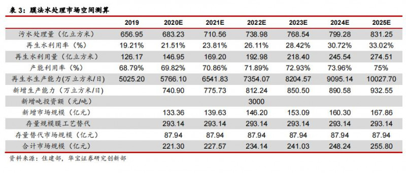 “十四五”期间的膜工艺市场规模合计 1207 亿元。根据此前测算(《污水资源化政策落地,打开“十四五”行业市场空间》),2019 年全国再生水利用率为 19.21%,2025 年全国再生水利用率为 33.02%。2019 年我国再生水的生产能力为 5025.20 万立方米/日,再生水利用量为 126.17 亿立方米,产能利用率为 68.79%,假设 2025 年产能利用率达到 75%,则 2025年全国再生水的生产能力为 10027.7 万立方米/日。新增市场规模由 2020 年的 133 亿元上升至 2025 年的 168 亿元,存量替代市场规模为 88 亿元/年,“十四五”期间的膜工艺市场规模合计 1207 元。