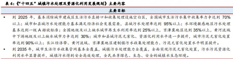 5)污水收集管网:新增 2025 年基本消除城市建成区生活污水直排口和收集处理设施空白区,全国城市生活污水集中收集率力争达到 70%以上,2035 年城市生活污水收集管网基本全覆盖。