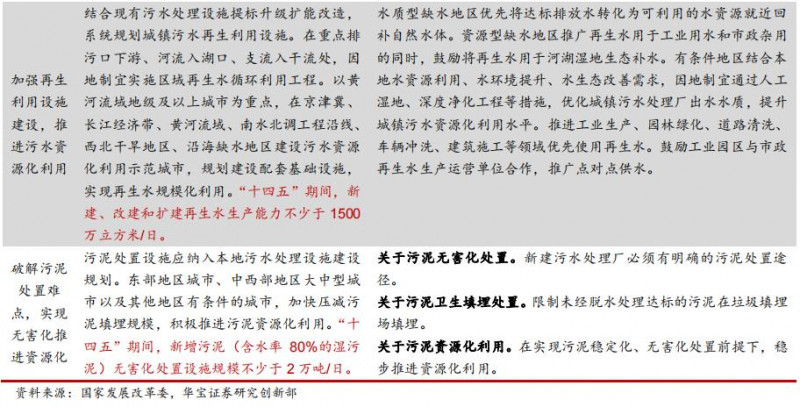 4)污泥无害化处置:“十四五”期间,新增污泥(含水率 80%的湿污泥)无害化处置设施规模不少于 2万吨/日,相较于《“十三五”规划》降低 4.01 万吨/日。