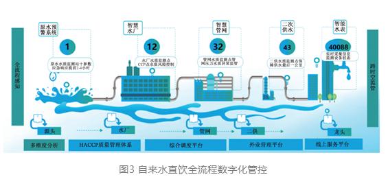 (1)自来水直饮供水全流程数字化管控。2018年底,深圳市盐田直饮水示范工程建成,盐田区率先成为中国首个实现自来水直饮的行政区域,开创了自来水直饮的先河。在盐田直饮示范工程上,深水集团通过智慧化手段,构建了盐田直饮数字化管控系统,实现了从“源头到龙头”水质安全监管一张图管理,实现了自来水直饮全流程数字化管控(见图3)。