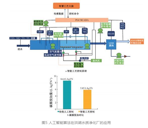 在洪湖水质净化厂,立足于传统的自动化控制及监控体系,运用多种人工智能算法进行数据分析,建立涵盖有机负荷降解、生物脱氮等环节的完整污水处理智能工艺大脑,从而实现了高可靠、高稳定、高精度的工艺优化调控,在保障出厂水质实时达标的同时节能降耗10%以上(见图5)。