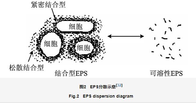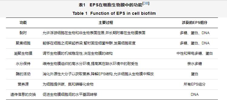 EPS中的多糖一般包括同质多糖、杂多糖、糖基、半乳糖基、戊糖残基、纤维素等。 蛋白主要包括聚合物降解酶和纤维状、淀粉状蛋白黏附素等。EPS的存在可以影响细胞周边环境中的孔隙率、密度、含水率、吸附性、机械稳定性等物理化学指标,进而影响细胞的生长[40-41]。EPS组分在细胞生物膜中的主要功能如表1所示。