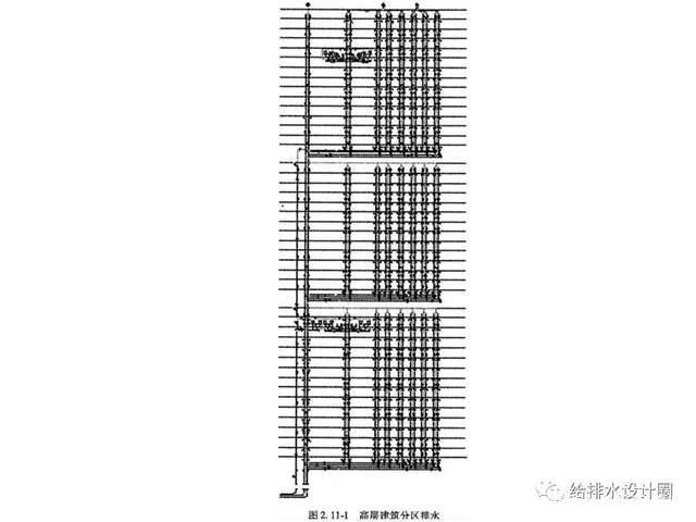 (1)分区排水的概念(参见图2.11-1)。指地上建筑部分排水采取按系统分段汇总的排水方式。按照终限流速定义,排水立管中的排水流速,流经一定长度后,流速不再增加。从理论上分析,似乎高层建筑无须在竖向上分段排水。但从安全排水角度出发,树上鸟教育给排水设计杨老师,尤其是超高层建筑,建议结合建筑竖向功能划分,进行合理分区排水。