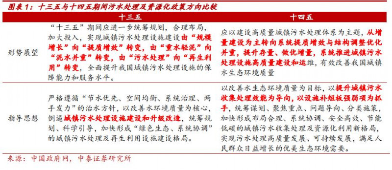 《规划》指出,“十三五”以来,城镇污水处理设施建设和运行管理力度不断加大,污水收集处理能力水平显著提升,《“十三五”全国城镇污水处理及再生利用设施建设规划》目标完成。同时,还存有污水管网建设改造滞后、污水资源化利用水平偏低、污泥无害化处置不规范,设施可持续运维能力不强等问题有待进一步解决。《规划》提出,“十四五”期间,应以建设高质量城镇污水处理体系为主题,从增量建设为主转向系统提质增效与结构调整优化并重,提升存量、做优增量,系统推进城镇污水处理设施高质量建设和运维,有效改善我国城镇水生态环境质量。整体而言,“十四五”期间污水处理及资源化利用设施建设仍将稳健增长,而提升城镇污水收集处理效能和设施补短板强弱项将为重点发展方向。