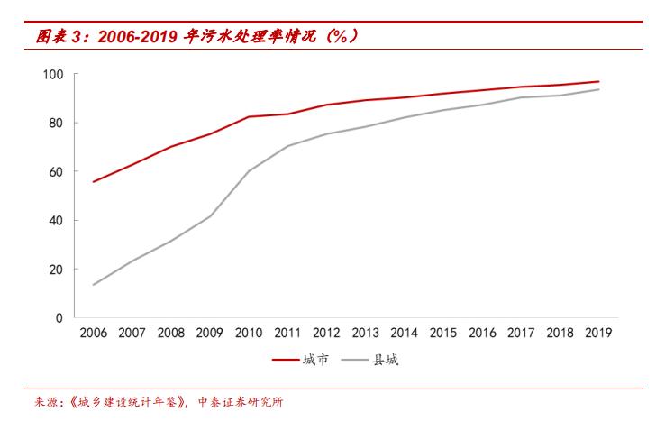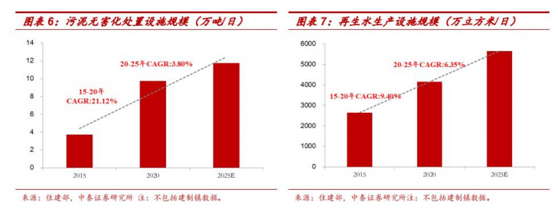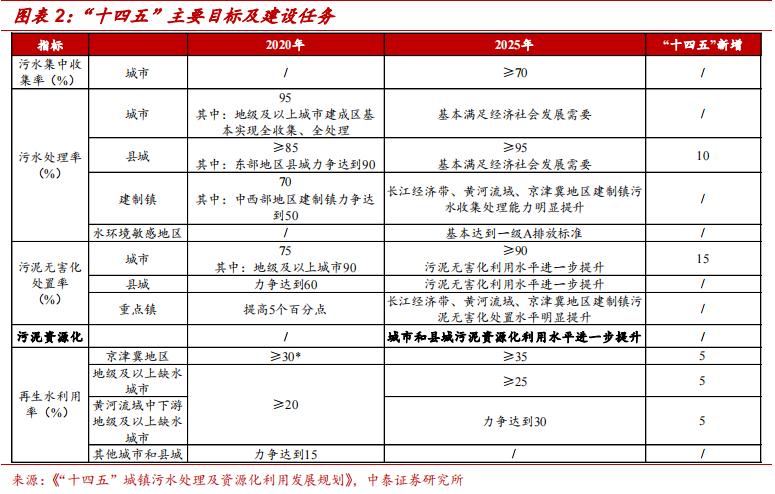 新增污水集中收集率指标,县城污水处理、城市污泥处置、再生水利用为主要增量空间。从《规划》提出的“十四五”期间污水处理及资源化利用主要目标来看,主要变化体现在:一是新增污水集中收集率指标。《规划》提出,到 2025 年,基本消除城市建成区生活污水直排口和收集处理设施空白区,全国城市生活污水集中收集率力争达到 70%以上。二是污水处理市场空间下沉,提高县城污水处理率目标。《规划》提出,到 2025 年,城市和县城污水处理能力基本满足经济社会发展需要,县城污水处理率达 95%以上,较 2020 年提升 10pct。三是明确城市污泥无害化处置要求进一步提升。《规划》提出,到 2025 年,城市和县城污泥无害化、资源化利用水平进一步提升,城市污泥无害化处置率达到 90%以上,较 2020 年提升 15pct。四是再生水利用持续增长且未来空间广阔。