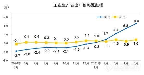 据相关分析,PPI上涨主要与能源和矿产等原材料价格大幅上涨有关。5月份,国际原油、铁矿石、有色金属等大宗商品价格大幅上涨,带动国内石油相关行业价格上涨,其中石油和天然气开采业价格环比上涨1.7%,同比上涨99.1%,黑色金属冶炼和压延加工业和有色金属冶炼和压延加工业价格分别环比上涨6.4%和4.4%,同比上涨38.1%和30.4%。当然,PPI同比9%的涨幅有一部分原因是去年低基数造成的,去年5月PPI同比涨幅为-3.7%,但是,相关能源、原材料等快速且持续涨价仍是主要原因。