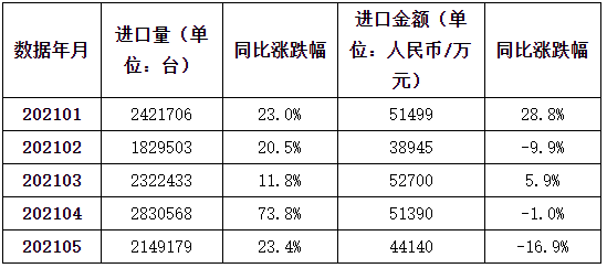 表1:2021年1-5月气体或烟雾分析仪进口量及进口金额统计