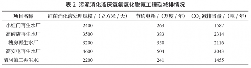 该技术是当今世界上最先进的污水生物脱氮技术,其利用亚硝态氮与氨氮反应直接生成氮气,与传统污水处理工艺相比,可节省占地、投资和运行费20%以上,节约能耗30%以上,节约药剂90%以上,全过程碳排放减少50%以上,为未来实现城市污水处理厂能源自给和能源供给提供支撑。北京排水集团自主研发了系统性厌氧氨氧化技术体系,已在北京五个污泥处理中心建成世界最大规模的厌氧氨氧化污泥消化液脱氮工程,总处理规模15 900立方米/天,每年因降低耗电量可减少碳排放1.05万吨(见表2)。