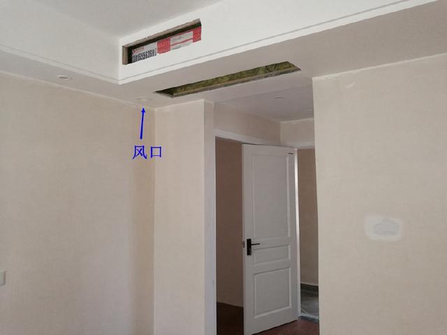 为了房间的顶面形状在吊顶后还能够是正方形,所以房间里吊顶通常是只在房间门口吊顶,这里可以兼容中央空调内机管道的隐藏,还能与衣柜兼容,由于新风的新风口与排风口只有75mm大,所以很多人都把这两个口布置在这边的吊顶上。