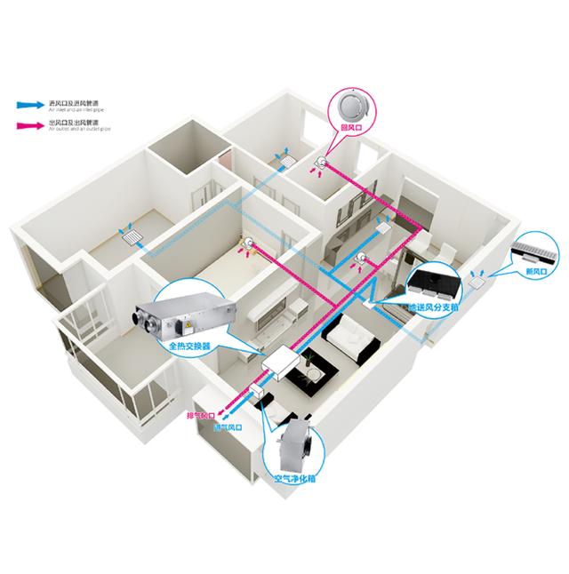 采用顶面排风+地面(墙脚)送风的方式,地面的排风还是推荐使用集中排风(在卧室过道上布置1-2个排风口),每个地方的新风口使用扁平管延伸到沙发区、床头、书桌等位置,可以是地面开新风口,也可以是距离地面20-30公分高的墙脚开新风口,这样的系统运行时,直接干净的新风会在地面位置送入,污浊的空气会从顶部排出去。