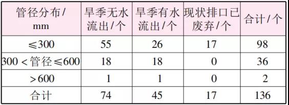 以1条暗涵为例,某河道上游暗涵长度约1 km,断面尺寸在1.5m×2.0m~2.7m×2.1m之间,根据排查成果显示,此暗涵排放口总数为136个,其中排查时有水流出的排放口有45个,根据水质检测结果显示,其有水流的排口,氨氮浓度大于20mg/L排口有37个。根据管径分布,排放口管径≤300mm的有98个,管径在300~600mm的有36个,管径大于1000mm的有1个,具体管径分布详见表2。根据排放口调查结果、检测水质以及已有管线资料对排放口进行判定,在45个有水流出的排放口中,排水户污水直排的排放口有22个,雨水管混流污水的排口23个,排口分布详见图7。