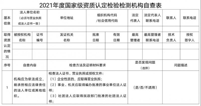 市场监管总局制订了《2021年度国家级资质认定检验检测机构自查表》(详见附件1),各国家级资质认定检验检测机构应于2021年6月15日前完成自查和整改,并上报自查情况。检验检测机构可登录http://47.94.146.244/,下载、上传电子版自查表。