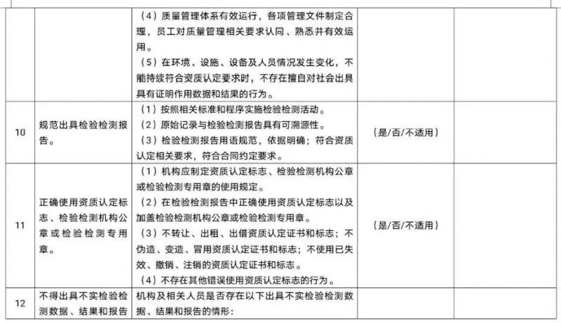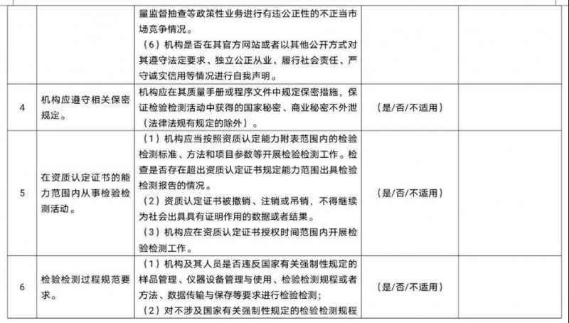 检验检测机构要增强主体责任意识,扎实开展自查,深入排查风险隐患,系统做好风险分析,并采取针对性措施有效预防、规避和降低风险。自查的重点为:管理体系是否有效运行,是否能够持续符合资质认定条件和要求;从事检验检测活动所必需的检验检测设备设施是否完备;检验检测活动是否符合国家相关法律法规的规定,遵循客观独立、公平公正、诚实信用原则;检验检测数据、结果是否真实、客观、准确等方面。