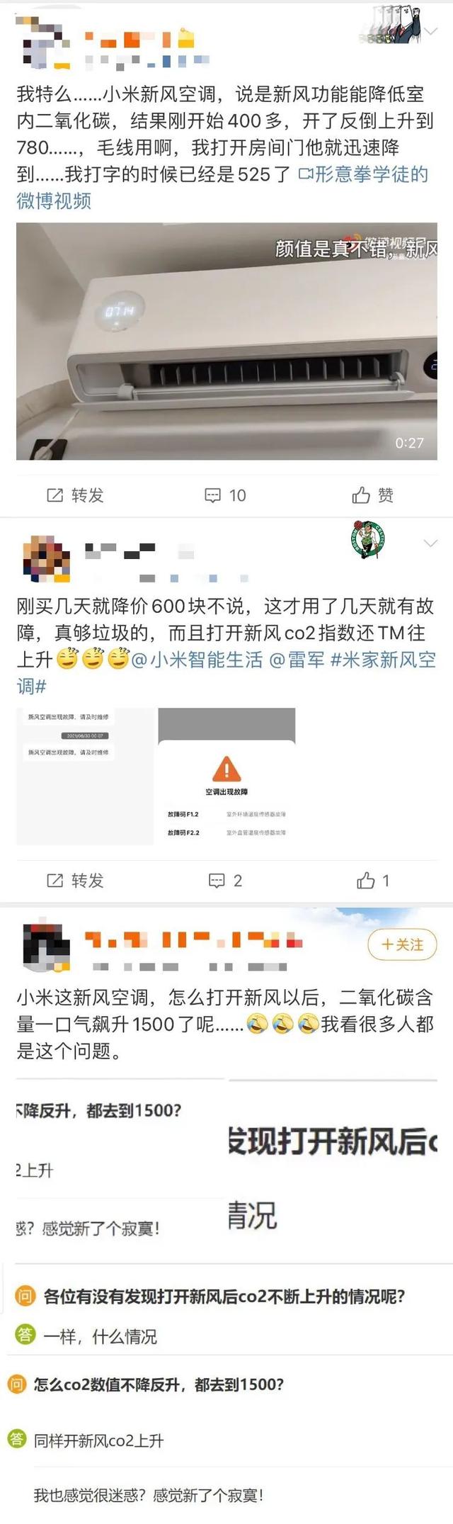 如近日米家的一款新风空调就遭到了网友的质疑,网友们在某社交平台上反馈了在使用米家新风空调中的问题,主要集中在“在开启空调新风功能时,二氧化碳浓度不降反升”。小编检索发现,该问题不止个例。此外,有家电媒体对其进行了相关测试,测试发现米家新风空调标注的新风量为60m3/h,但实测数据仅有一半。新风功能开启后,2个小时之后空气质量依旧很差。