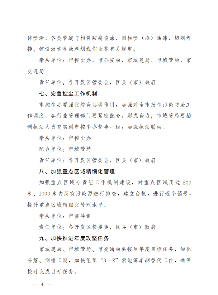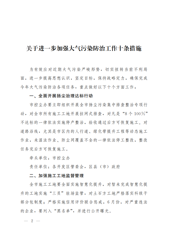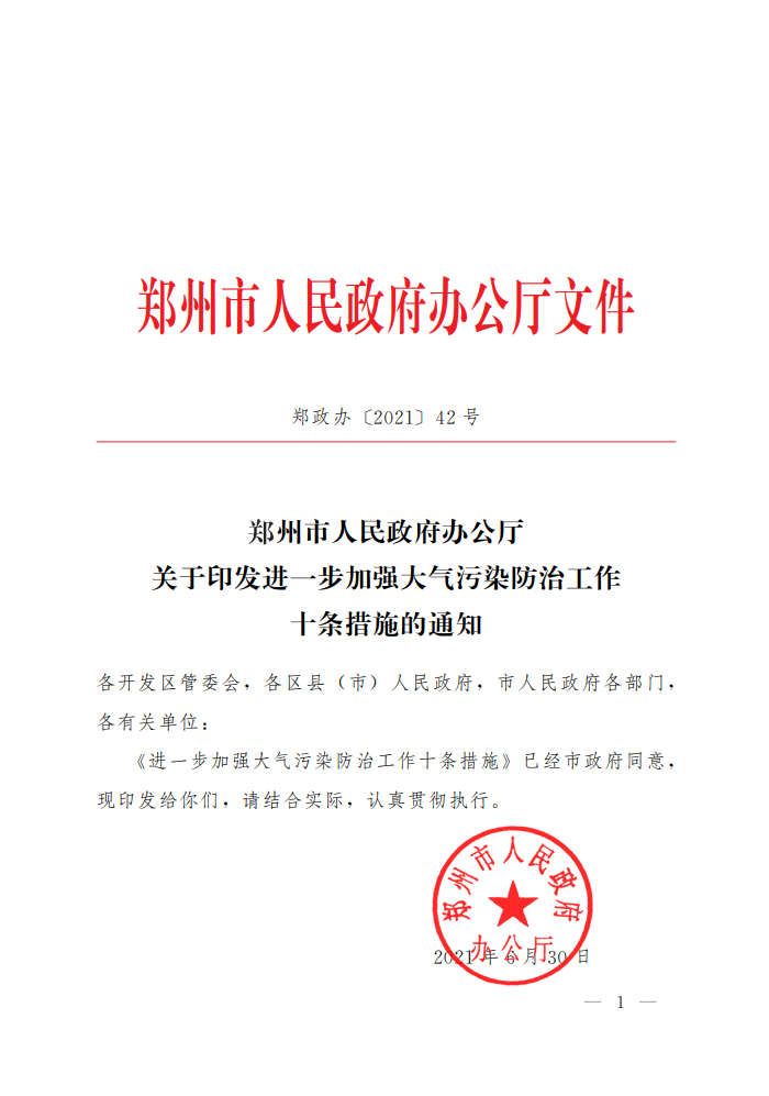 近日,郑州市人民政府办公厅发布《进一步加强大气污染防治工作十条措施》(简称《措施》),让蓝天白云常驻。《措施》要求,郑州要全面开展扬尘治理达标行动。郑州市控尘办要立即组织开展全市扬尘污染集中排查整治专项行动,对郑州全市所有施工工地开展拉网式排查,对凡是“8个100%”(即工地周边100%围挡、各类物料堆放100%覆盖、土方开挖及拆迁作业100%湿法作业、出场车辆100%清洗、施工现场主要场区及道路100%硬化、渣土车辆100%密闭运输、施工工地100%安装在线视频监控、工地内非道路移动机械及使用油品100%达标)不达标的一律依法实施停产整治,验收通过后方可恢复施工。加强VOCs(挥发性有机物)原辅材料源头替代,严格落实高温时段禁止墙体喷涂、各类管道与构件防腐喷涂等作业的规定。全文如下: