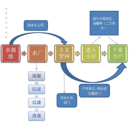 图注:自来水的诞生过程:供水企业保证水在进入小区时合格,而进入居民家前的“最后一公里”,一般由开发商、物业或房产所有者来负责