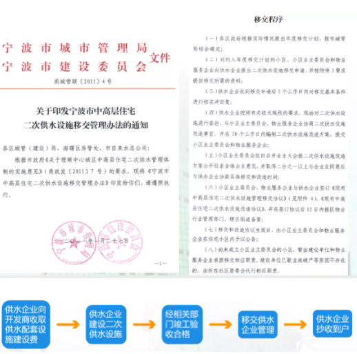 如宁波市在2010年1月份出台了《关于理顺中心城区二次供水体制的实施意见》,要求新建住宅直接管水到户。既有的二次住宅分三年进行改造。2011年,宁波市城市管理局、建设委员会印发《宁波市中高层住宅二次供水设施移交管理办法》,明确了建设单位、物业企业、供水企业及业主等在改造过程中的职责及工作程序。(如下图)这次改革,被行业认为开创了“政府主导、企业实施、新老全面接收”的宁波模式。经过持续优化和改进,宁波现已基本形成了二次供水从体制改革、设施建设到后期运行一整套较为系统的管理经验。