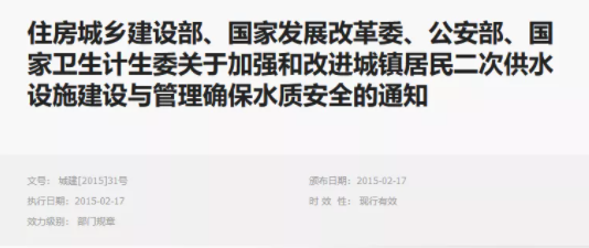 在各地探索的基础上,2015年,住建部、国家发改委、公安部、国家卫计委联合发布了《关于加强和改进城镇居民二次供水设施建设与管理确保水质安全的通知》(建城[2015]31号),正式要求各地推进二次供水设施运行维护专业化,鼓励供水企业通过统建统管等方式,对二次供水设施实施专业运行维护,并规定二次供水设施的运维费用原则上并入供水价格进行弥补。