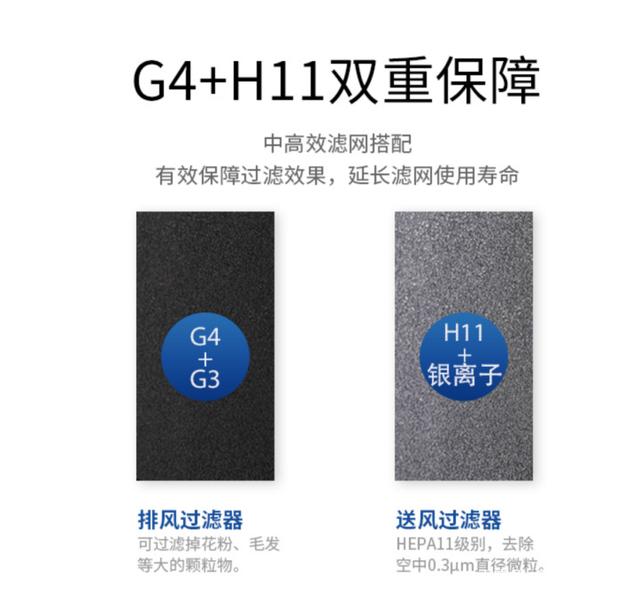 博乐新风采用HEPA过滤技术,同时通过G4+H11的双重滤网实现更高净化效能的过滤,G4+G3过滤器可以有效过滤花粉、毛发等大颗粒物,HEPA11级别的送风过滤器,则可以去除直径为0.3微米微粒。