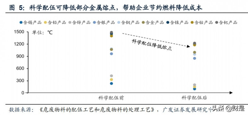 针对不同品质的危废,配伍工艺为基础也为重中之重,可降低部分金属熔点节约燃料,使得危废处理过程更经济。不同种类危废的配伍可以降低火法处置危废的熔点,不仅提取更多品类的金属,还能减少燃料用量。科学的配伍工艺可大幅节省成本,助力公司处理多来源、广品质危废,从而扩大规模提升市占率。