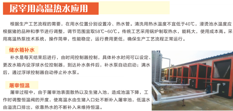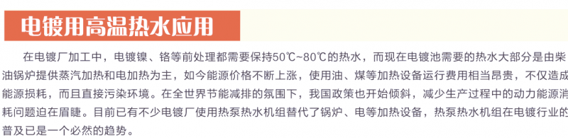 高温空气源热泵技术作为一种高效、环保、节能的供热制冷技术可以应用于所有的采暖空调和热水供应系统,并可以和其它新能源技术有机结合,提高综合利用效率。据公开资料显示,目前的高温空气源热泵在国内工程中的实际应用主要有如下几种形式:1. 燃煤或燃油( 气) 锅炉改造。直接替代供热锅炉,具有占地少,工程量小,环保,安全,运行费用低等优势,可以直接接驳散热其采暖系统而不需要改造末端系统,虽然一次投资高于普通供热锅炉,但因其运行费用仅相当于燃煤锅炉的60%,其增加的投资可以在3-5 年内收回;2. 在一些特殊工业行业中的需用热水温度60℃以上的生产用水。如电镀业,化工行业,漂染业等;3. 与太阳能供热系统的结合。目前太阳能越来越多的应用到建筑热水供应和空调采暖系统之中,但是因为太阳能资源的不稳定性,基本上需要常规能源作为辅助,如采用电锅炉、燃油( 气) 锅炉辅助加热。将高温空气源热泵与太阳能结合用于建筑热水供应和采暖系统,一方面可以节省大量的能源费用,减少对环境的污染。另一方面,对太阳能热水的温度要求降低,在满足供热温度的同时极大提高了太阳能集热器的吸热效率,减少集热器的投资。随着新能源利用和节能建筑技术的进一步推广,建筑能耗逐渐降低,高温空气源热泵的应用空间将越来越大,出现更多的应用形式。