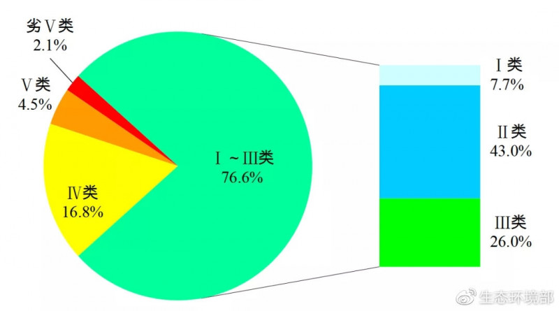 2021年6月,3641个国家地表水考核断面中,水质优良(Ⅰ~Ⅲ类)断面比例为76.6%,同比上升3.3个百分点;劣Ⅴ类断面比例为2.1%,同比下降1.1个百分点。主要污染指标为化学需氧量、高锰酸盐指数和总磷。