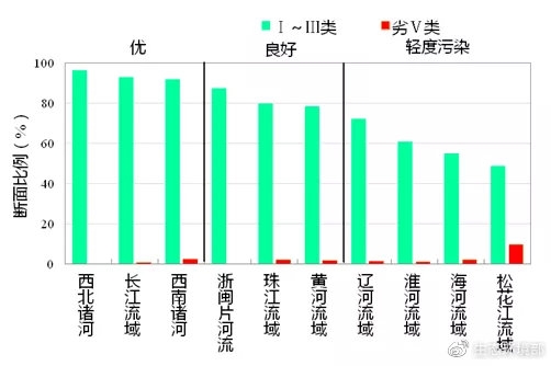 6月,长江、黄河、珠江、松花江、淮河、海河、辽河等七大流域及西北诸河、西南诸河和浙闽片河流水质优良(Ⅰ~Ⅲ类)断面比例为78.6%,同比上升2.2个百分点;劣Ⅴ类断面比例为1.7%,同比下降1.1个百分点。主要污染指标为高锰酸盐指数、化学需氧量和总磷。其中,西北诸河、长江流域和西南诸河水质为优;浙闽片河流、珠江和黄河流域水质良好;辽河、淮河、海河和松花江流域为轻度污染。